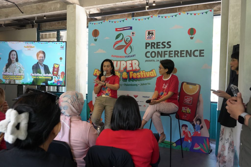 Talkshow Press Conference 28th Superindoversary diisi oleh dua pembicara. [Ki-ka]: Yuvlinda Susanta ( Head of Corporate Affairs & Strategic Event Management Super Indo,) dan Christina Natalia ( Head of Merchandising Super Indo). (Foto: Dok. Super Indo)