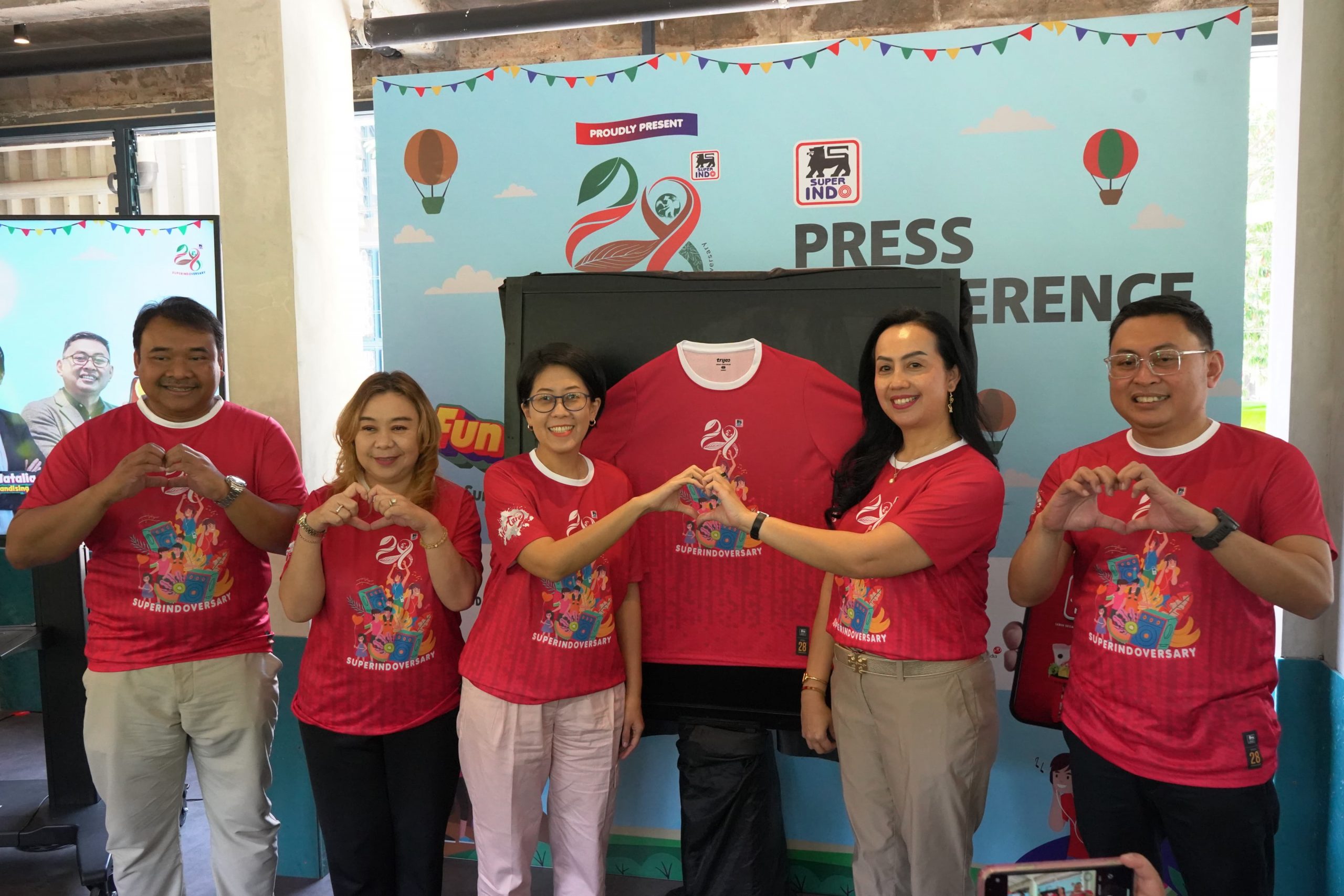 [Ki ka]: Pujo Pramono (Direktur Operation & Sales MDMedia), Henny Damayanti (Head of Non-food & GMS Super Indo), Christina Natalia (Head of Merchandising Super Indo), Yuvlinda Susanta (Head of Corporate Affairs & Strategic Event Management Super Indo), Joko Susanto ( National Head of Retail Operation Super Indo) di acara Ceremonial Peluncuran 28th Superindoversary di Jakarta, Kamis (24/7/2025). (Foto: Dok. Super Indo)