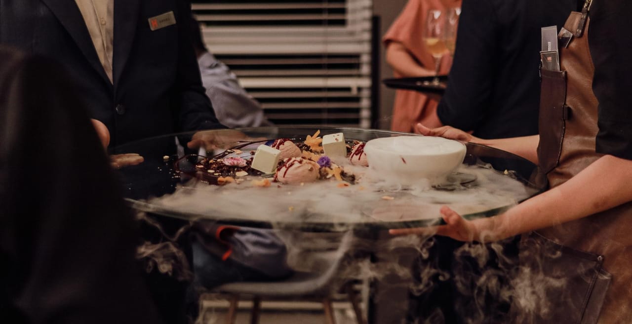 Acara ditutup manis dengan sajian fusion dessert dari Chef Gerald, yang disajikan langsung di atas permukaan kaca. Kombinasi Chocolate Ovomaltine Muesli, Earl Grey Cremeux, Strawberry Jelly, dan Pistachio Ice Cream menghadirkan sensasi visual dan rasa yang elegan sekaligus playful. Penutup sempurna untuk malam yang penuh keajaiban rasa.