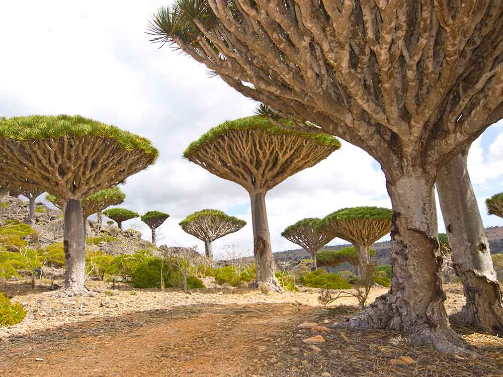 Salah satu hal yang paling ikonik dari Socotra adalah pohon Dragon Blood atau pohon Darah Naga. Bentuknya menyerupai payung besar dengan cabang-cabang menjulang ke atas, membuatnya mirip dengan piring terbang alien. Getah pohon ini berwarna merah pekat, sehingga dinamai “Darah Naga”. Sejak zaman kuno, getah ini digunakan untuk obat, pewarna, hingga ritual mistis. Saat kamu melihatnya langsung, rasanya seperti masuk ke dunia lain—unik, indah, dan penuh misteri.