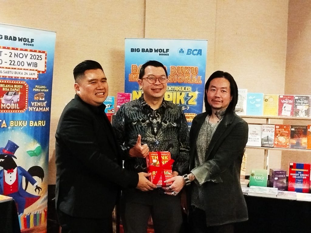 Ki-ka: Marthius Wandi Budianto (Direktur BBW Indonesia), Fandy (Senior Vice President of Transaction Banking Business Development BCA) dan Andrew Yap (Pendiri Big Bad Wolf (BBW) Books) di Konferensi Pers Bazar Buku Internasional “Big Bad Wolf 2025” di Jakarta, Rabu (8/10/2025). (Foto: Urbanvibes/R Indriani)