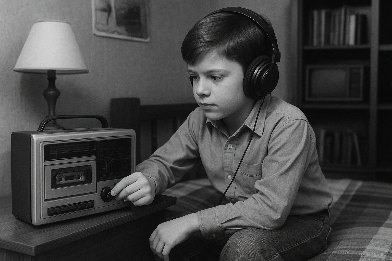 Bayangkan masa kecil di mana hiburan utama adalah radio dan TV tabung, seperti yang terlihat di foto hitam-putih di atas. Seorang anak dengan serius memutar tombol radio, berusaha menangkap siaran favoritnya — momen sederhana yang menggambarkan kehidupan sebelum semuanya berubah jadi serba digital.