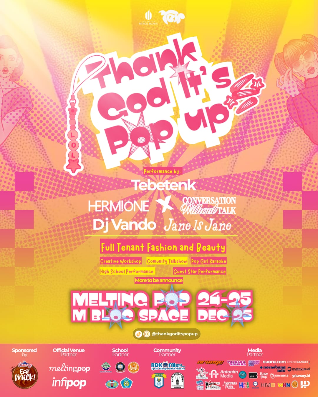 Tak hanya itu, panggung TGIP juga akan diramaikan oleh Guess Star dari HERMIONE x Conversation Without Talk, serta Jane Is Jane, band indie pop yang tengah mencuri perhatian lewat karya-karya yang relatable dan berkarakter kuat. Untuk menjaga vibe tetap panas hingga malam, DJ Vando siap membakar semangat pengunjung dengan track pilihan yang memicu nuansa pesta di area Melting Pop.