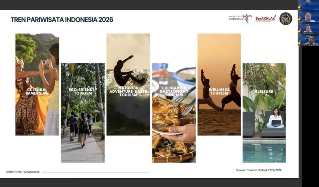 Asisten Deputi Manajemen Strategis Kemenpar, I Gusti Ayu Dewi Hendriyani, dalam diskusi daring “Ruang Diskusi Strategis ke-12: Penerapan Quality Tourism di Indonesia” yang digelar di Jakarta, Senin (22/12/2025), menjelaskan dalam beberapa tahun terakhir pariwisata Indonesia menunjukkan pemulihan dan pertumbuhan ke arah yang positif. Namun demikian, pertumbuhan semata dinilai belum cukup untuk menjawab tantangan jangka panjang sektor pariwisata.