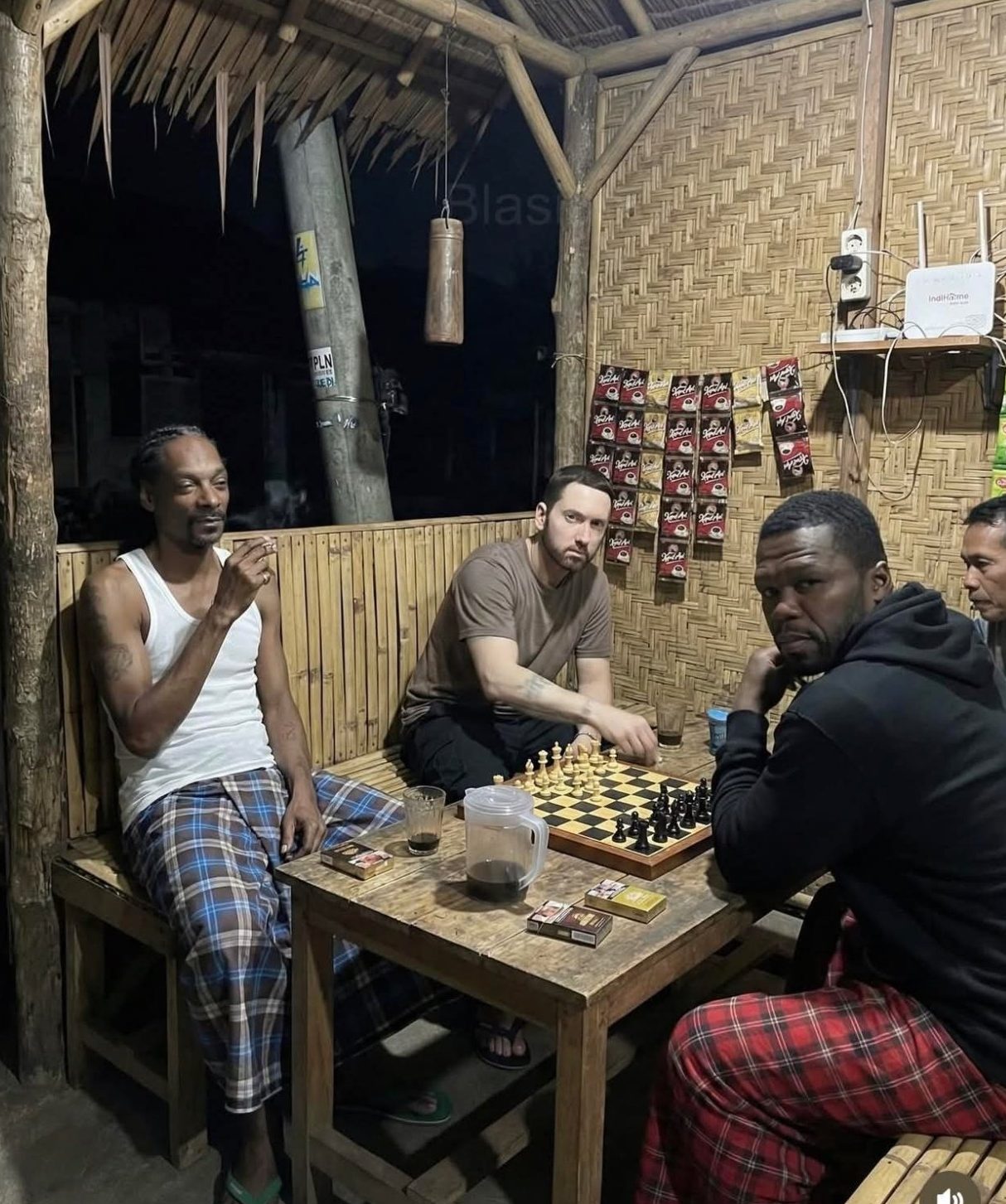 Foto tersebut menampilkan tiga figur yang sangat familiar bagi penggemar hip-hop dunia: Snoop Dogg, Eminem, dan 50 Cent. Namun alih-alih berada di studio rekaman mewah atau ruang eksklusif khas selebritas Hollywood, mereka tampak duduk santai di sebuah bangunan sederhana berbahan bambu. Suasananya sangat akrab dengan memori kolektif masyarakat Indonesia—mirip warung kopi kampung atau saung pinggir desa.